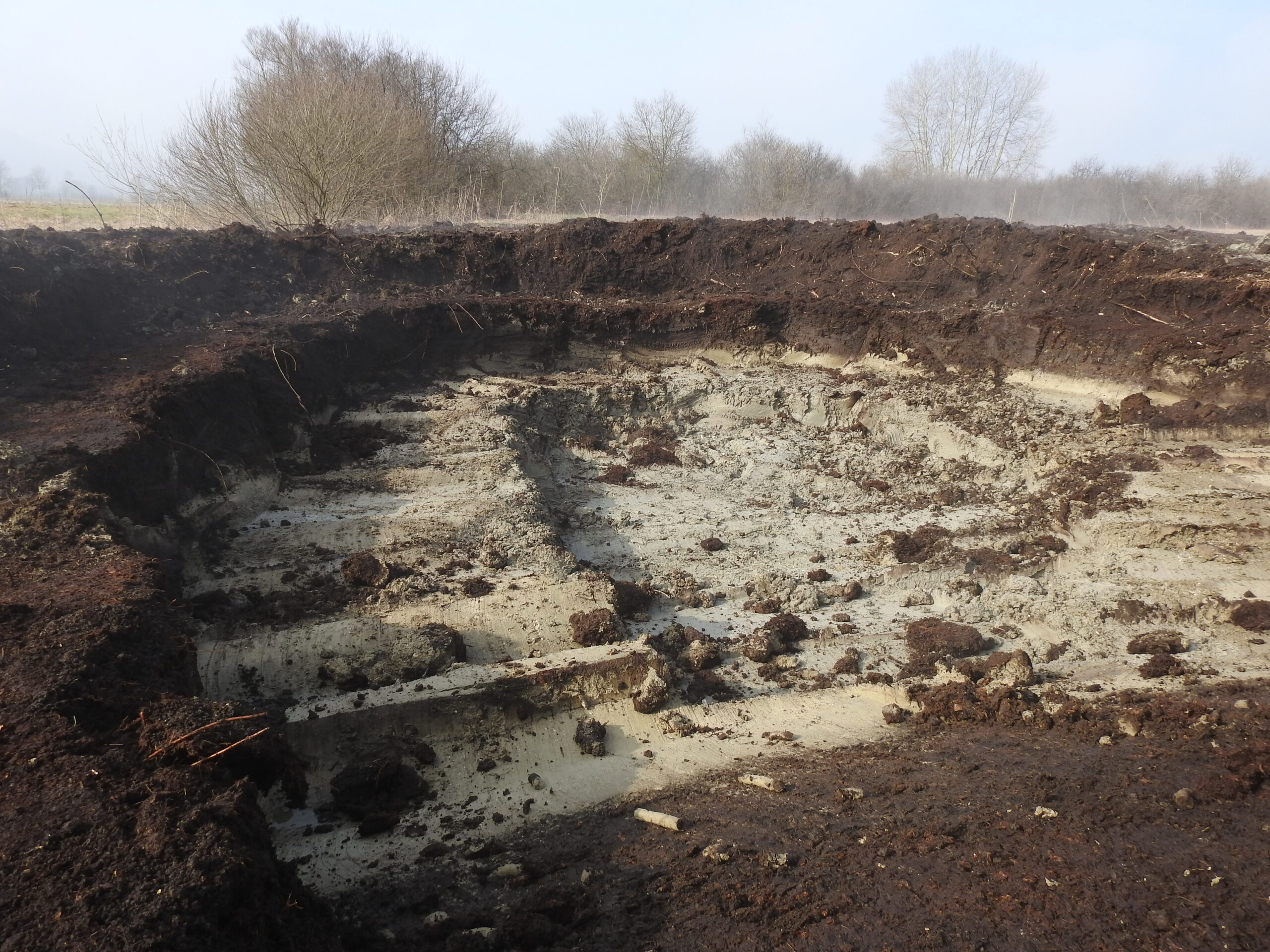 As ecological requirements of different amphibian species vary, we have excavated 5 different types of ponds. In Ljubljansko barje, a layer of clay (the sediment of a prehistoric lake, made up of snail and mussel shells) is found in the soil horizon. As this layer holds water, no additional impermeable layers are installed. Some of the ponds have already been filled with water during excavation, while others will be filled by rainwater.