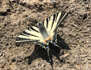 Der seltene Schwalbenschwanz (Iphiclides podalirius) trinkt Wasser auf dem feuchten Boden neben dem neuen Teich.