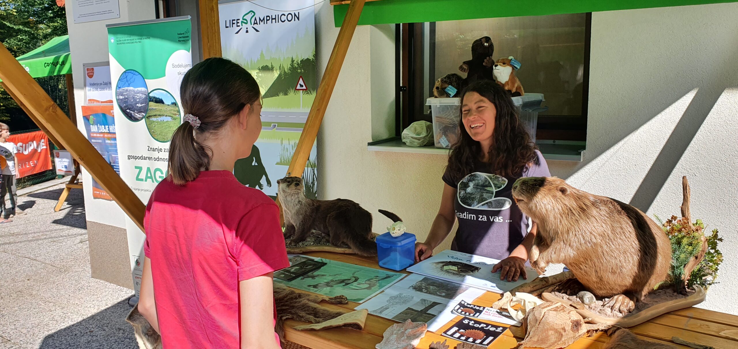 Das Froschhaus wurde im Juli 2021 eröffnet, und seither haben viele Aufklärungsaktivitäten über die Bedeutung des Naturschutzes stattgefunden. Eine dieser Aktivitäten fand am Sonntag, dem 17. September, im Rahmen des Festivals „Grosuplje v jeseni“ statt. Wir haben eine dem Naturschutz gewidmete Veranstaltung mit dem Namen Froschhaustag durchgeführt. An diesem Tag konnten sich Familien und Einzelpersonen über Amphibien und die Maßnahmen informieren, die wir im Rahmen des LIFE AMPHICON-Projekts zum Schutz von Amphibien und zur Erhaltung ihrer Lebensräume durchführen. Der Tag war auch der Vernetzung gewidmet – wir hatten das Projekt LIFE BEAVER (Lutra, Institut für die Erhaltung des Naturerbes) mit einer Präsentation über Fischotter und Biber zu Gast sowie die Slowenische Herpetologische Gesellschaft, die die Reptilien Sloweniens vorstellte. Die Besucher konnten an einer Führung durch die Ausstellung im Froschhaus teilnehmen, einem Vortrag über nicht heimische und invasive Arten zuhören, sich naturschutzorientierte Geschichten ansehen und einem Kinderchor lauschen, der Lieder über Frösche sang. Auch an hausgemachten Leckereien von lokalen Erzeugern mangelte es nicht.