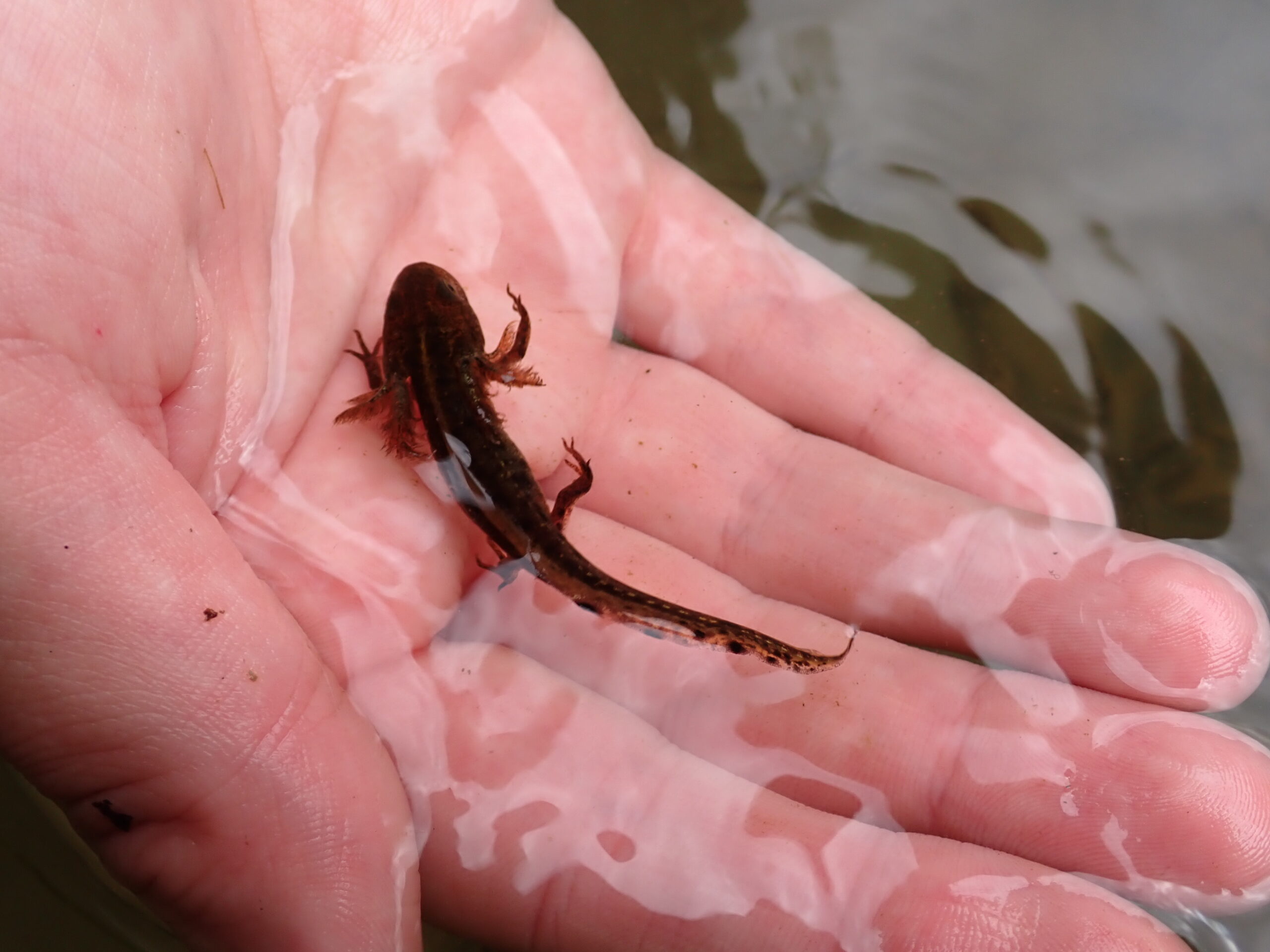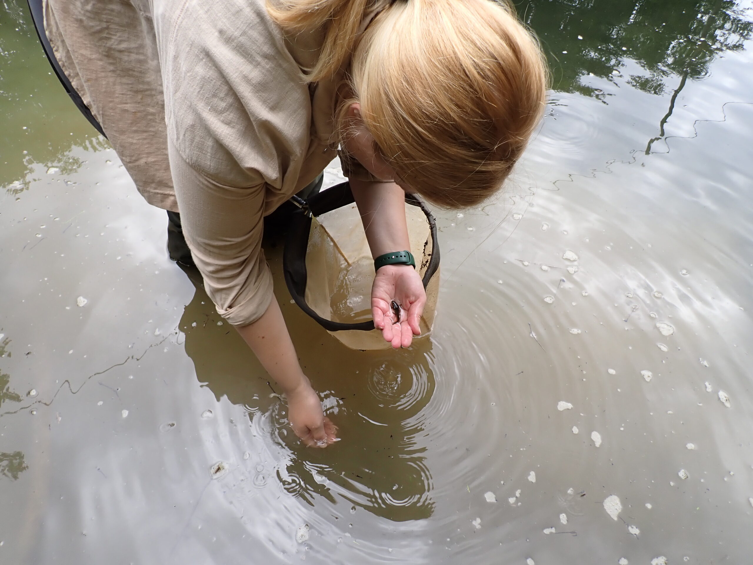 Am Ende des Sommers führen wir eine letzte Inspektion der Wasserlebensräume durch. In dieser Phase interessiert uns besonders, wie viele Larven sich erfolgreich für das Landleben umgewandelt haben. Wir beproben die Teiche erneut mit dem Kescher. Außerdem notieren wir das mögliche Vorhandensein von Fischen und den Wasserstand im Teich.